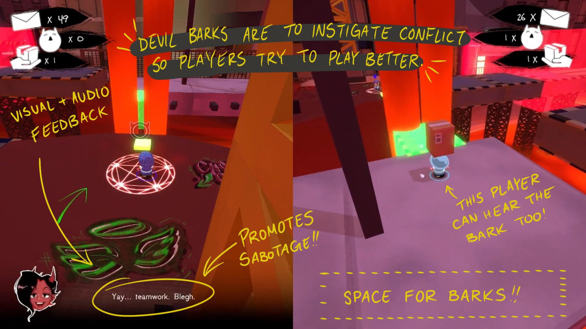 Documents featuring thematic character dialogue barks for the Devil.Spoken in-level to sway the players' decisions and to instigate conflict for some devilish gameplay.