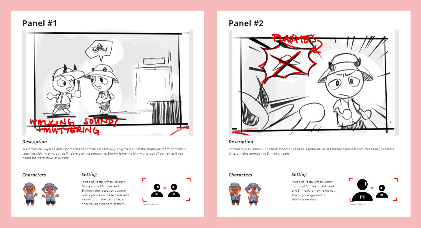 Layouts of each comic storyboard used for backstory and conclusions to each quest.Comics are animated and sequenced to match the overall lighthearted theme of the game while providing players with story context.