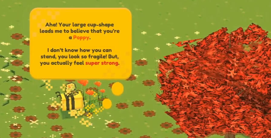 Full script of dialogue shown in the game.Dialogue is split into seven days; facts are split by time of day/flower.The dialogue is spoken by the bee to provide players with thematic and contextual facts backed up by "beesearch".