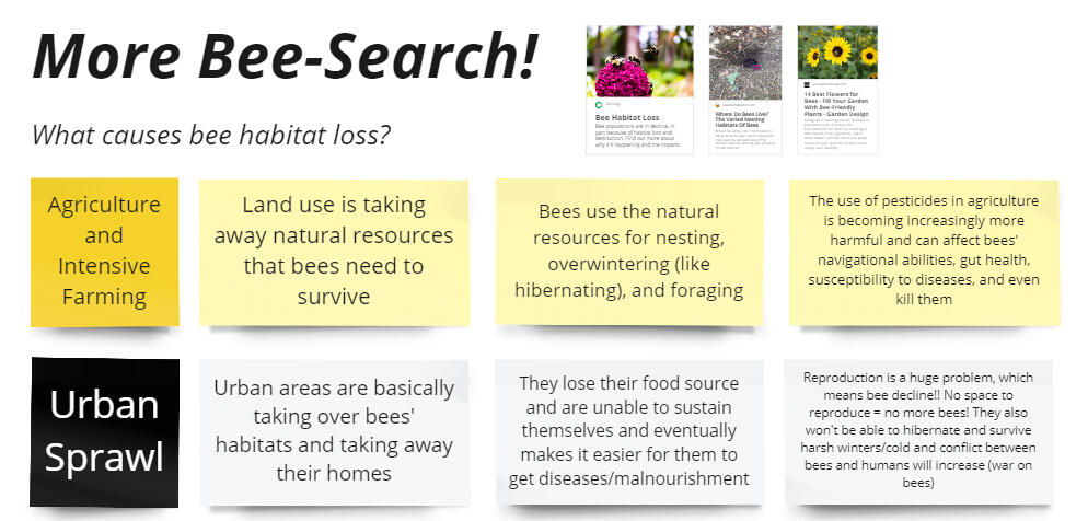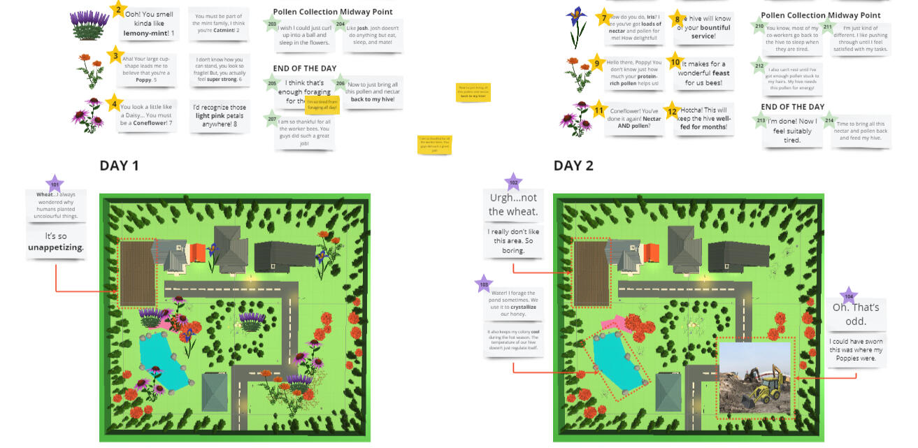 Research conducted on subjects related to the bee ecosystem, lifestyle, and habitat.A collection of credible facts turned into digestible tidbits of bee dialogue to be shown to the player.